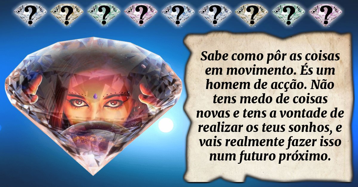 Sabe como pôr as coisas em movimento. És um homem de acção. Não tens medo de coisas novas e tens a vontade de realizar os teus sonhos, e vais realmente fazer isso num futuro próximo.