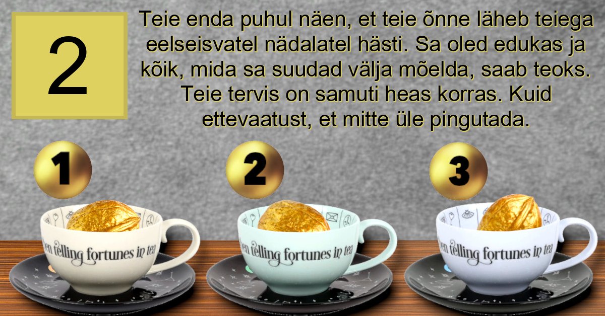 Teie enda puhul näen, et teie õnne läheb teiega eelseisvatel nädalatel hästi. Sa oled edukas ja kõik, mida sa suudad välja mõelda, saab teoks. Teie tervis on samuti heas korras. Kuid ettevaatust, et mitte üle pingutada.