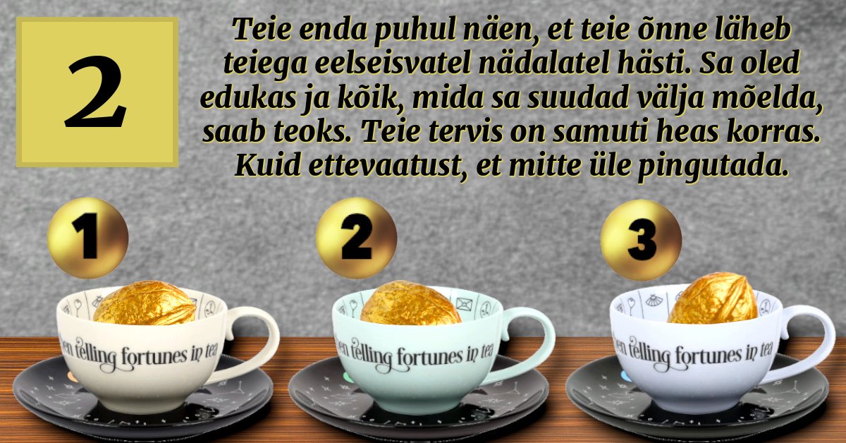 Teie enda puhul näen, et teie õnne läheb teiega eelseisvatel nädalatel hästi. Sa oled edukas ja kõik, mida sa suudad välja mõelda, saab teoks. Teie tervis on samuti heas korras. Kuid ettevaatust, et mitte üle pingutada.