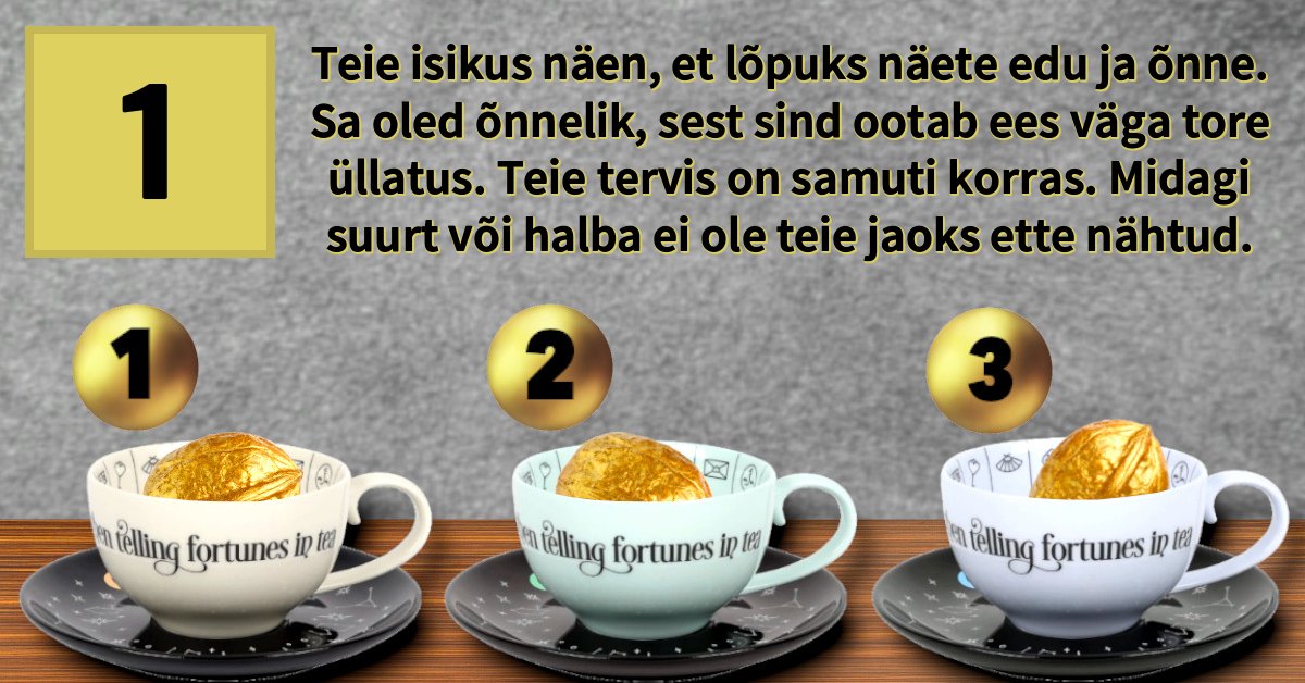 Teie isikus näen, et lõpuks näete edu ja õnne. Sa oled õnnelik, sest sind ootab ees väga tore üllatus. Teie tervis on samuti korras. Midagi suurt või halba ei ole teie jaoks ette nähtud.
